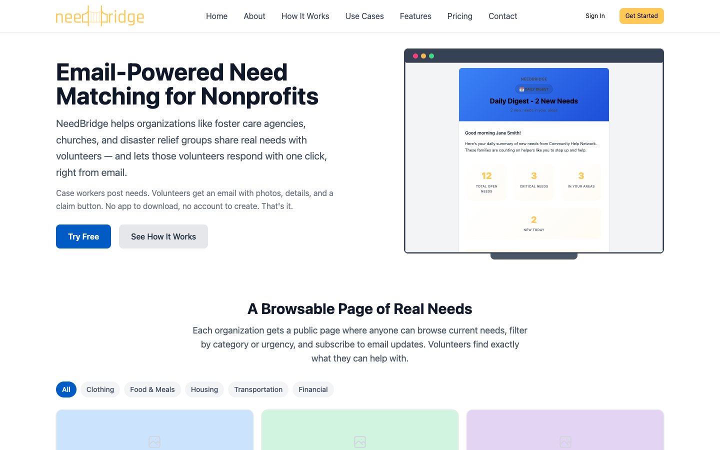 Nonprofits were losing momentum to volunteer coordination bottlenecks and tool friction. NeedBridge made response simple by letting case workers post needs and volunteers claim them directly from email.